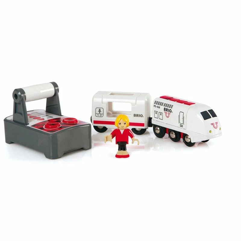 This remote controlled Travel Train by Brio will change the dynamics of your wooden railway. Whether its Brio wooden rail or other leading wooden rail brands this RC Travel Train will be a treasured train on and off the track. The RC Travel Train includes radio control with 2 channels that is able to turn on travel train lights, sound horn and move forward, stop and reverse. The train consists of a engine and carriage which is able to take one passenger. The train can also by controlled by pressing the buttons on top of the engine. This set includes Remote Control, travel train engine, travel train trailer and figurine.
