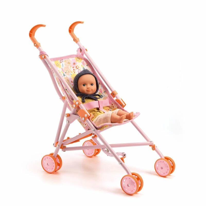 The Flower Doll Umbrella Stroller is a classic toy for doll play! Tuck your doll in the seat to push around indoors and outdoors, then fold it up to store away. It is designed to fold down easily without pinching fingers. This small stroller will fit dolls 30 to 34cm and be enjoyed by young children for play!