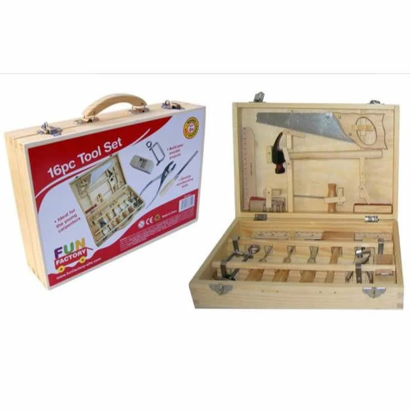 This Tool Set by Fun Factory contains 16 pieces of genuine wood working metal and wooden tools in a sturdy wooden carry case for older children to start tinkering in carpentry. This set provides a introduction to carpentry and includes a hammer, saw, ruler, spirit level, set square, sand paper block, chisel, pliers, screw drivers, clamp and other accessories. Fun Factory have manufactured this item from plantation pine and beechwood.