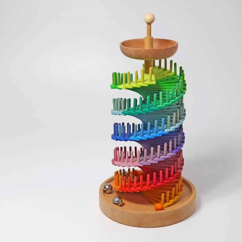 This beautiful Grimm’s Rainbow Assembly Ball Run is the perfect addition to your Grimm’s collection. Your little one will need to build this marble run from bottom to top stacking all the colours together. Once built you can race two marbles at the same time guessing who the winner will be. Endless hours of fun is to be had building and rebuilding. This marble run is perfect for challenging both older and younger children. This toy is perfect for imaginative and creative play.