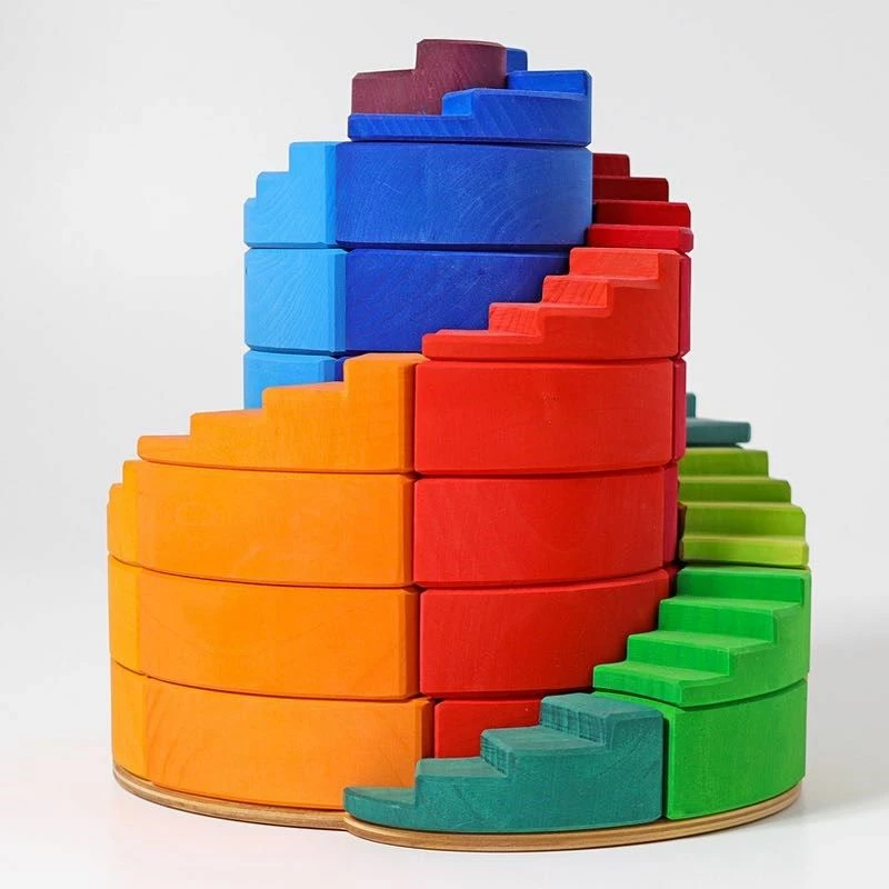 This rainbow Counterrotating Stepped Spiral is a part of Grimm’s 4×4 Series. Grimm’ s has made building more interesting with these counterrotating block.This set included 56 Rainbow blocks which provides your children endless hours of fun, they can create magical staircases or mysterious towers. These blocks are helping to develop your little ones fine motor skills, imaginative and creative play with this open ended toy.