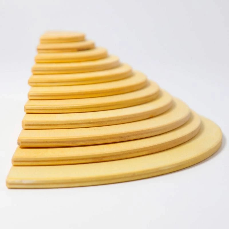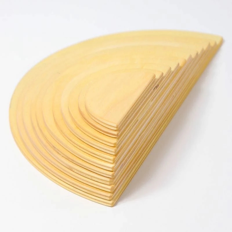 Children and adults alike will love to explore and create with this Natural Large Semi Circles by Grimm’s. These Semi Circles can be combined with other Grimm’s wooden products to build inventive and flexible structures. The Semi Circles consist of 11 pieces.