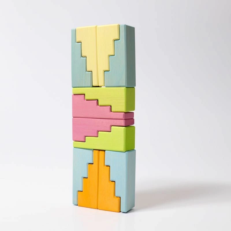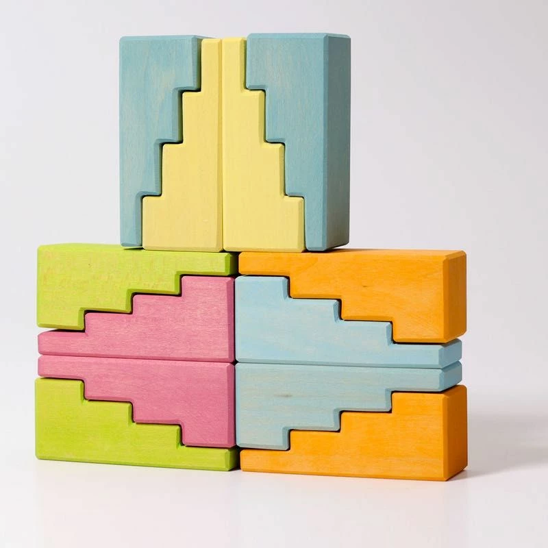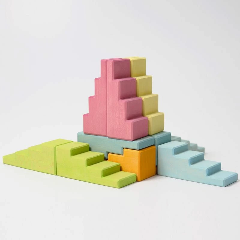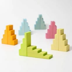 These Pastel Stepped Roof’s from Grimm’s make every build climbable. These stepped blocks work perfectly with all other Grimm’s products to create stairs or join two to make a roof. These blocks can also be used on their own to create beautiful pastel structures. These colourful geometric blocks are perfect for open ended play.