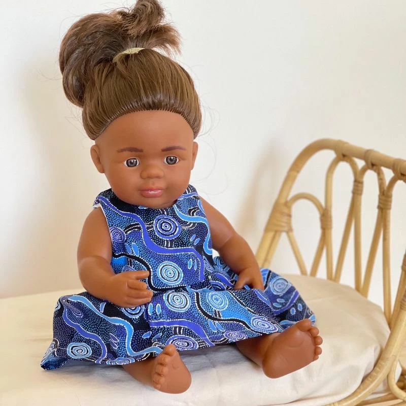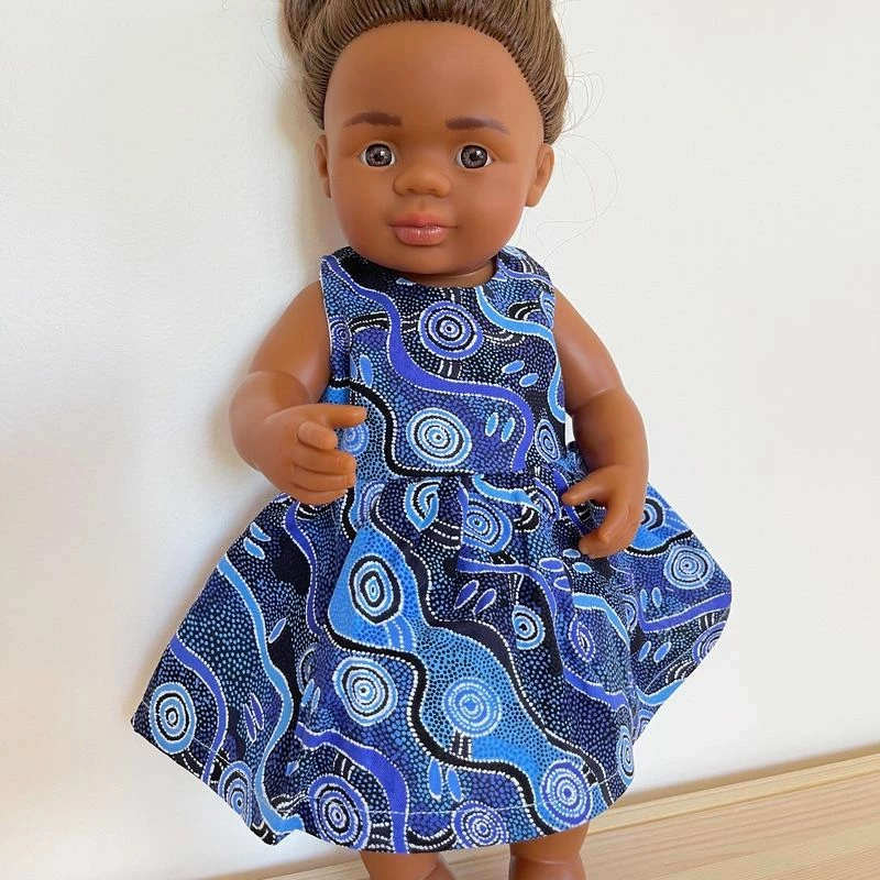 The Desert Tracks Blue Summer Dress is a wonderful new outfit for your doll! Designed as part of their Indigenous doll clothing collection, it has any easy-to-use velcro opening on the back! It will fit the 38cm Miniland Dolls & 34cm Paola Reina Dolls! Made For Mia doll clothing is all handmade in Rockhampton.