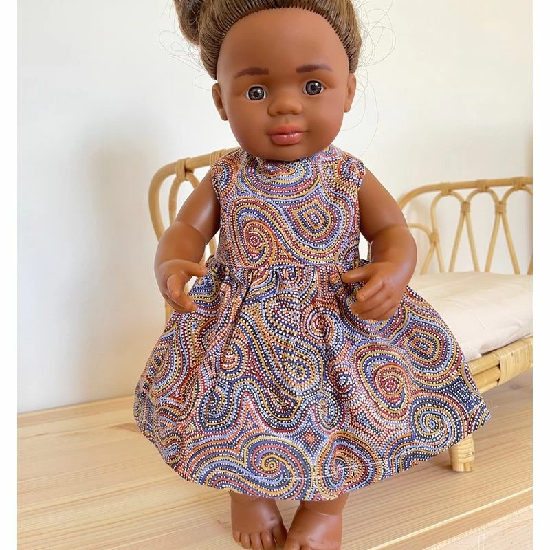 Children can put the beautiful Mina Mina Dreaming dress on their Aboriginal Miniland Doll! This wonderful dress features artwork by an Indigenous artist. It will fit the 38cm Miniland Dolls & 34cm Paola Reina Dolls! Made For Mia doll clothing is all handmade in Rockhampton.
