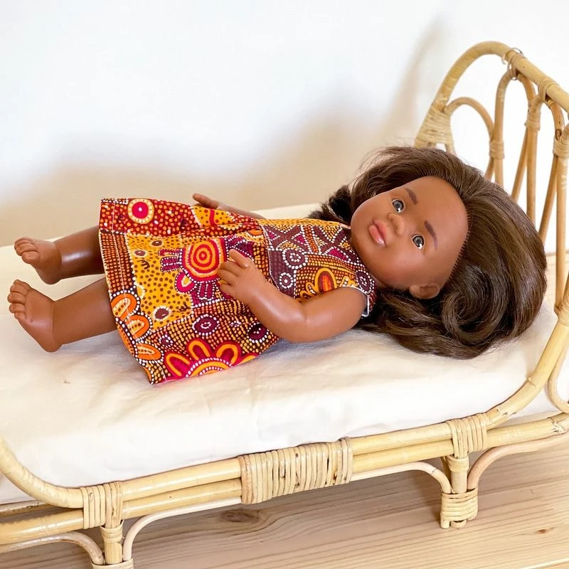 This vibrant dress is perfect for your Miniland 38cm Aboriginal Doll! The Spinifex Summer Dress is a lovely outfit with a beautiful Indigenous artwork printed on the material. It has an easy-to-use velcro opening on the back, so dressing any doll is easy! It will also fit the 34cm Paola Reina Dolls! Made For Mia doll clothing is all handmade in Rockhampton.