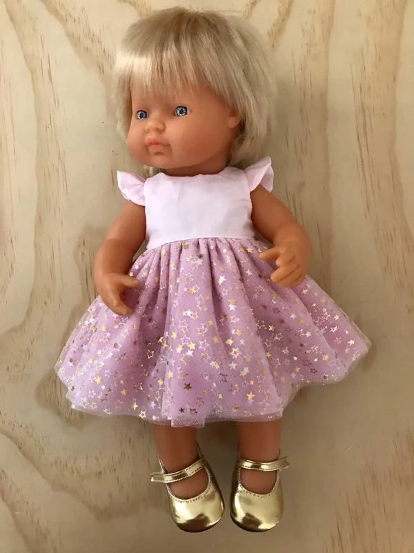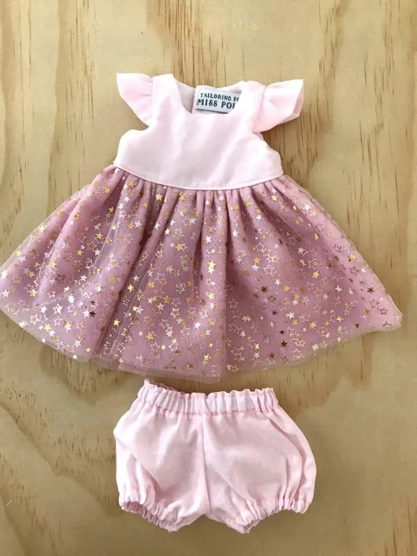 Add a touch of magic to play time and put your doll in the Gold Star Dust dress! This pretty pink outfit has a tulle skirt covered in shiny gold stars, and comes with matching pink bloomers.