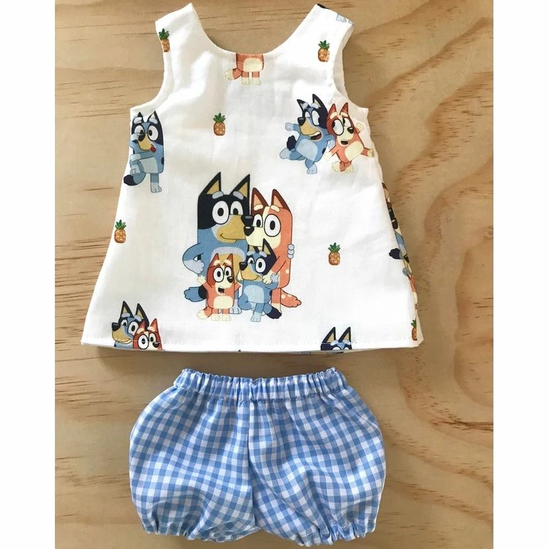 The Bluey Family Fun dress is the perfect outfit for summer fun! This handmade dress featuring the beloved characters of Bluey comes with blue bloomers, all designed to fit a 38cm doll.