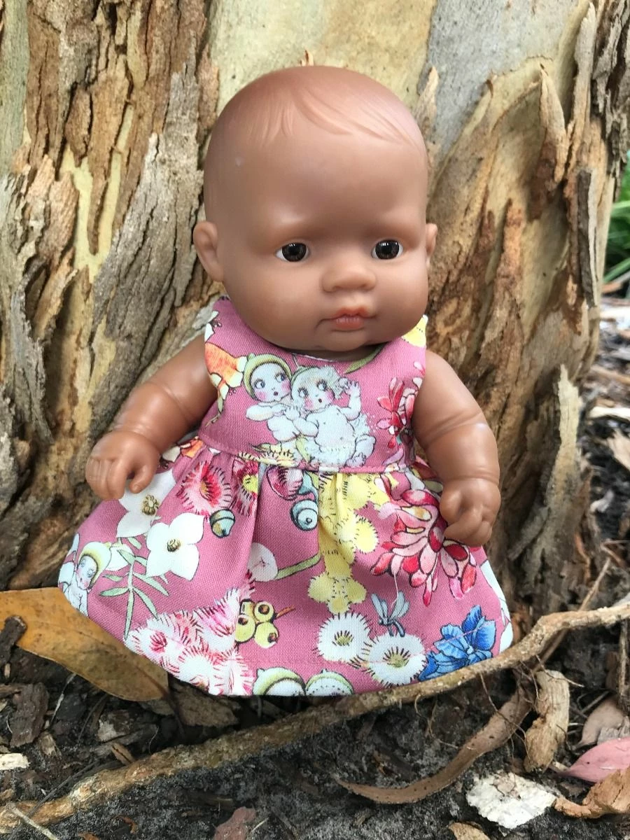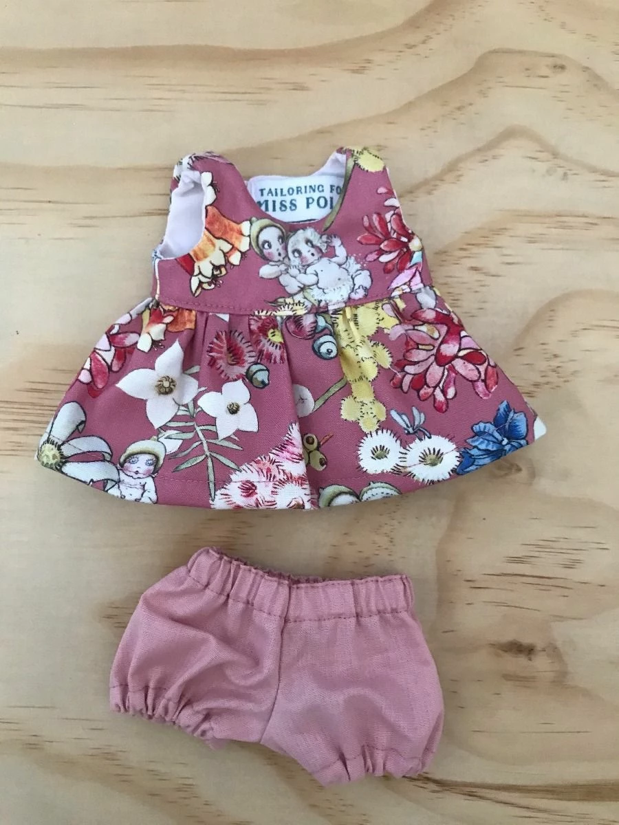 The adorable Pink Snuggle Pot & Cutie Pie Dress comes with matching bloomers, so your doll will have the perfect coordinated outfit. Measured to fit a 21cm, this outfit shows a beautiful May Gibbs design. Tailoring For Miss Polly creates quality hand made dolls clothes, testing them on their own Miniland dolls to get the best fit. While every effort is made to ensure the images are accurate representations of the products, colours and tones may vary on different screens.