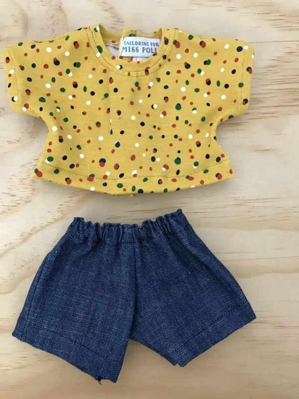 This cute and colourful Shorts Set has a fun Mustard shirt with Multi-coloured blobs! The shirt and dark denim shorts are designed to fit 38cm dolls.