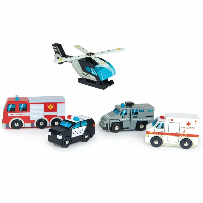 Little ones will race to the rescue with this colourful wooden emergency vehicles set. The set comes with 5 exciting vehicles that can become a key part of imaginative play. Drive the emergency vehicles around the put out fires, help injured people, and make sure the streets are safe. Protect the skies with the helicopter, with blades that actually spin!