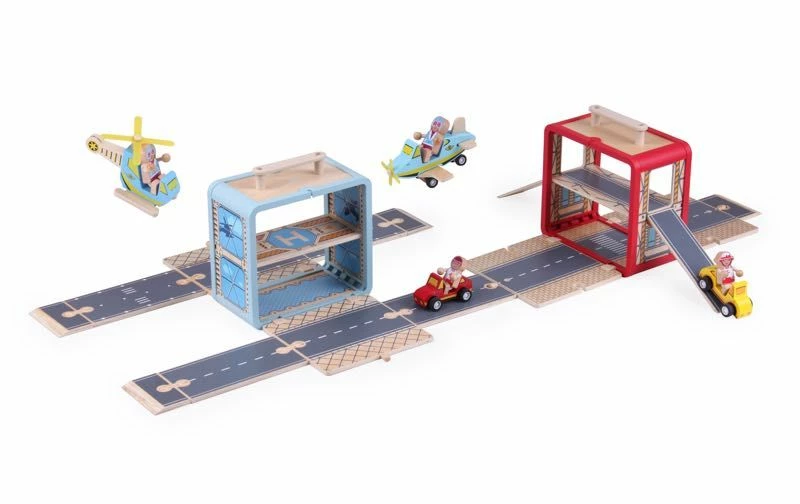 Each Airport Boxset contains: 1 Plywood Box, 1 x Planes, 1 x Helicopter, 1 x Helipad, 4 x Straight Road Pieces, 4 x Plastic Connectors.