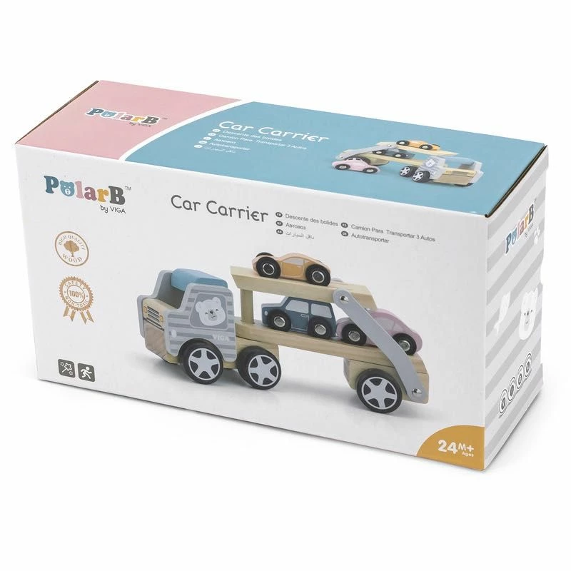Transport your cars in this cute scandi inspired Car Carrier. This beautiful pastel carrier is from Viga’s Polar Bear collection. Your little one will be occupied for hours loading the 3 cars, pushing and unloading them. This two story, car carrier features pastel colours along with a cute polar bear. This toy is perfect for developing their fine motor skills along with imaginative play.